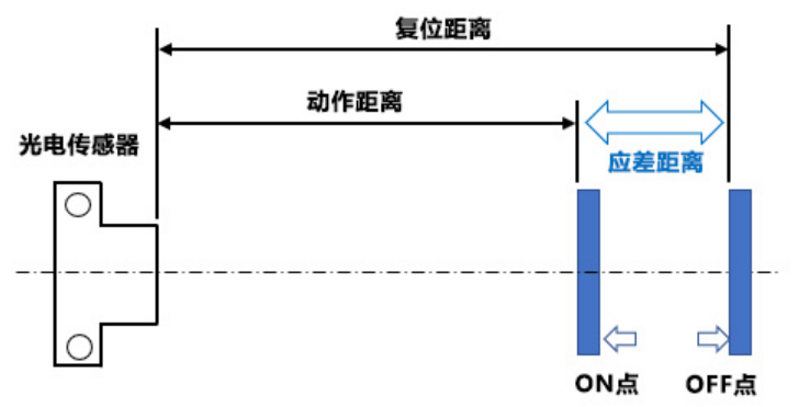 首先跟大家解釋下何為應差,應差簡而言之就是距離,那是哪里到哪里的距離呢?下文會為大家做一個詳細的舉例說明,其文字描述為反射型光電傳感器時間動作距離與復位距離之差,稱為“應差”。