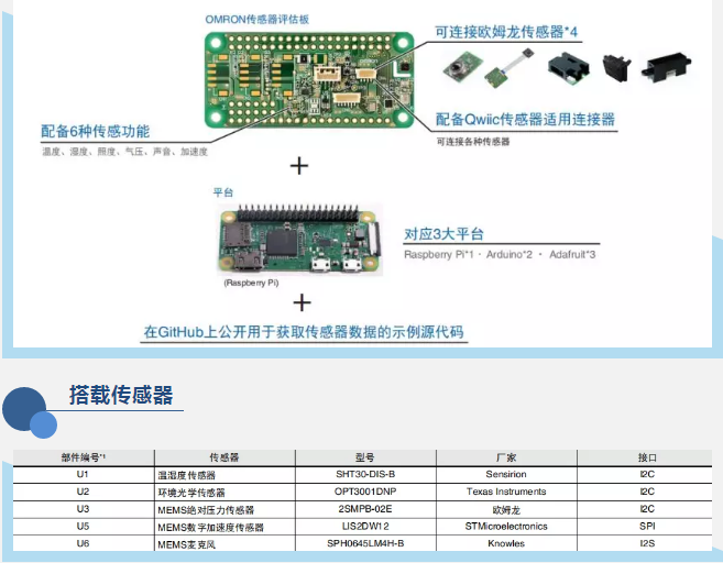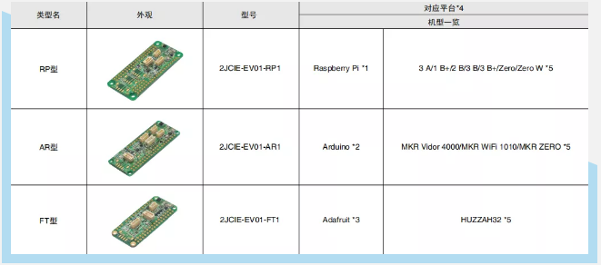 2JCIE-EV評(píng)估板共有以下三種型號(hào):2JCIE-EV01-RP1、2JCIE-EV01-AR1、2JCIE-EV01-FT1,分別對(duì)應(yīng)了Raspberry Pi*1、Arduino*2、Adafruit*3三大平臺(tái)。