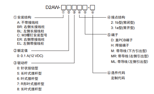 歐姆龍D2AW微動開關具有小型的外觀尺寸,并且根據安裝結構、額定值、驅動桿類型、節點結構、端子以及定制代碼的不同,可提供多種型號產品,以便客戶根據實際應用需求進行選擇。