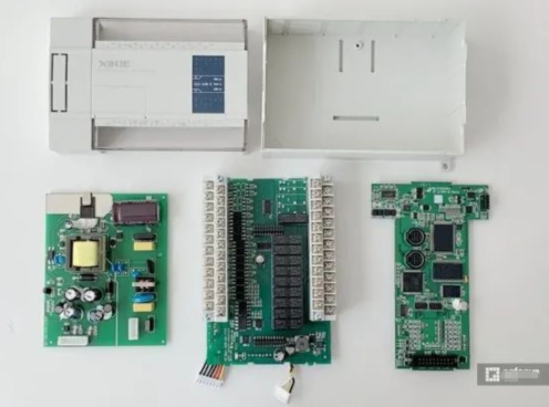 PLC 在 PCB 設計上分為了 3 個板子,從左至右分別為電源板、IO 口板以及主控板。