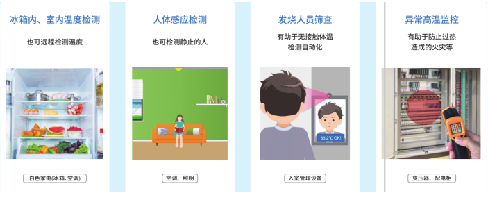 人體檢測:根據細微的溫度差和溫度變化進行檢測,適用于家電節能,安防設備,門禁人體測溫等;