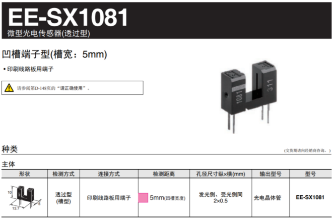 EE-SX1081 是一款透射式光電傳感器, PCB安裝。光電傳感器是一種緊湊型光學(xué)傳感器, 可通過(guò)光束感應(yīng)物體的位置。通用型號(hào)帶有5mm寬槽。高分辨率0.5mm寬孔徑, 光電晶體管傳感器輸出。透射式光電傳感器包含發(fā)射器和檢測(cè)器, 面對(duì)對(duì)方, 當(dāng)物體位于發(fā)射器和檢測(cè)器之間, 物體會(huì)攔截發(fā)射器的光束, 從而減少檢測(cè)器接受的光信號(hào)。-25至85°C 工作溫度范圍