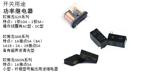 機床工作的過程中,通常需要通過電源、線圈、馬達、通電、通用外部輸出來進行運動的傳輸,此時繼電器主要起開關作用,并且對繼電器觸點的開關容量、觸點可靠性、壽命要求比較高。可以選用以下歐姆龍功率繼電器: