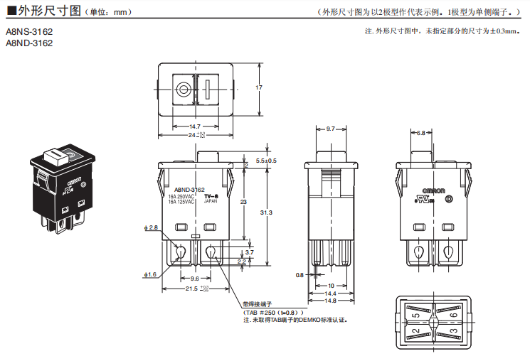 A8M 小型船型開關 實現16A開關性能的小型船形開關 小型、16A的開關性能。 可進行一觸式安裝。 符合UL、cUL認證,EN標準適用品。