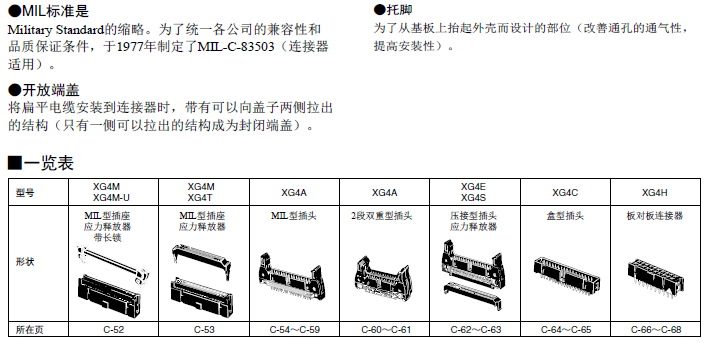 印刷基板連接器的核心、MIL規(guī)格標(biāo)準(zhǔn)品 通過(guò)采用新型生產(chǎn)力設(shè)計(jì),高可靠性與低價(jià)格的同步實(shí)現(xiàn)。 備有便于省空間封裝的盒型插頭(XG4C)。 同時(shí)具有可進(jìn)行中繼使用的壓接型插頭(XG4E)。 將本公司的散線壓接型連接器(XG5)特有插頭(XG8)與PCB型(XG2)組合使用可實(shí)現(xiàn)種類豐富的各種封裝。 適用本公司自己開(kāi)發(fā)的簡(jiǎn)易鎖定擺桿可以使特有插頭(XG8)和盒型插頭(XG4C)也能夠進(jìn)行鎖定。 MIL規(guī)格(MIL-C-83503)標(biāo)準(zhǔn)。 標(biāo)準(zhǔn)品符合UL規(guī)格(File No. E103202)認(rèn)證產(chǎn)品。